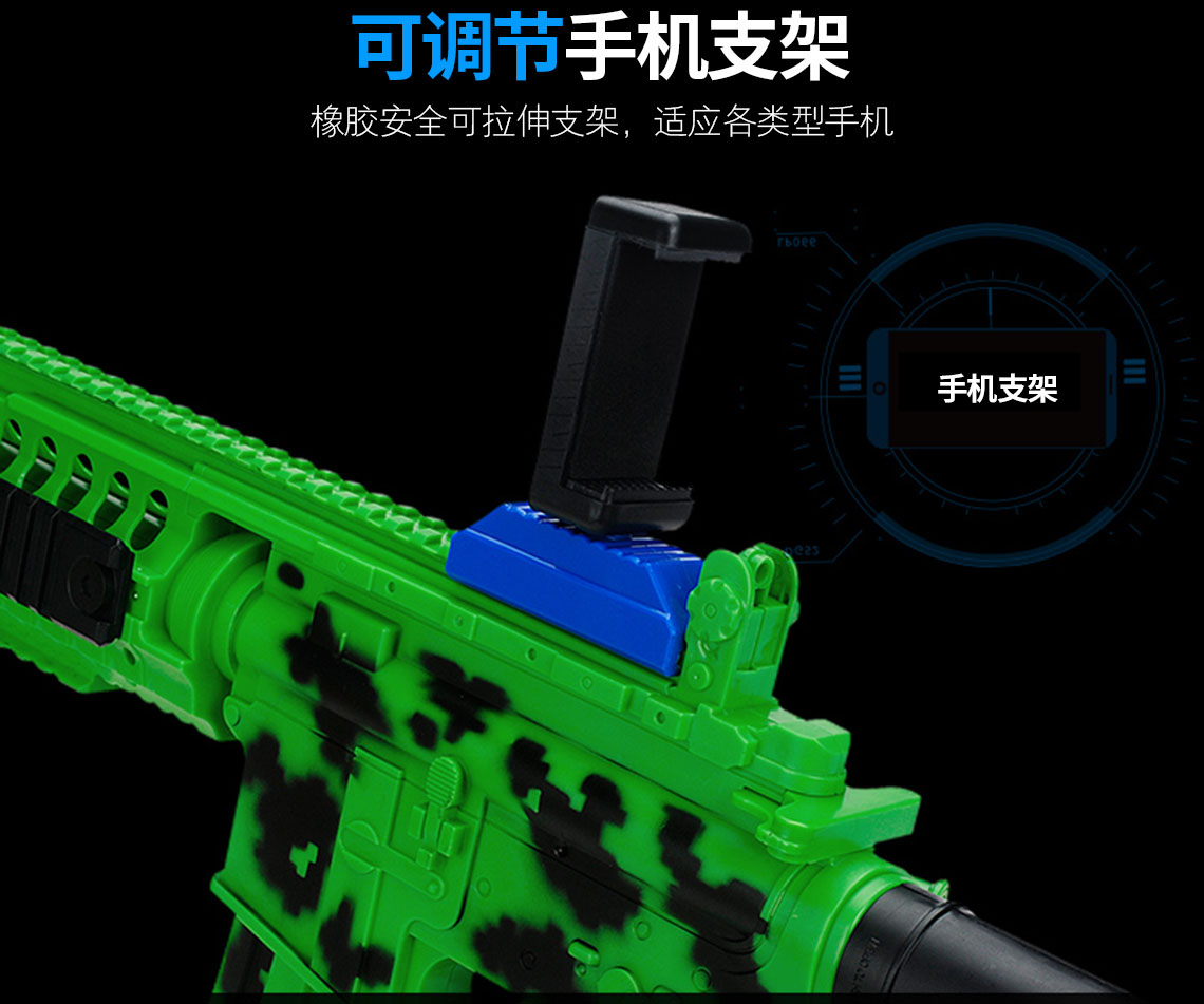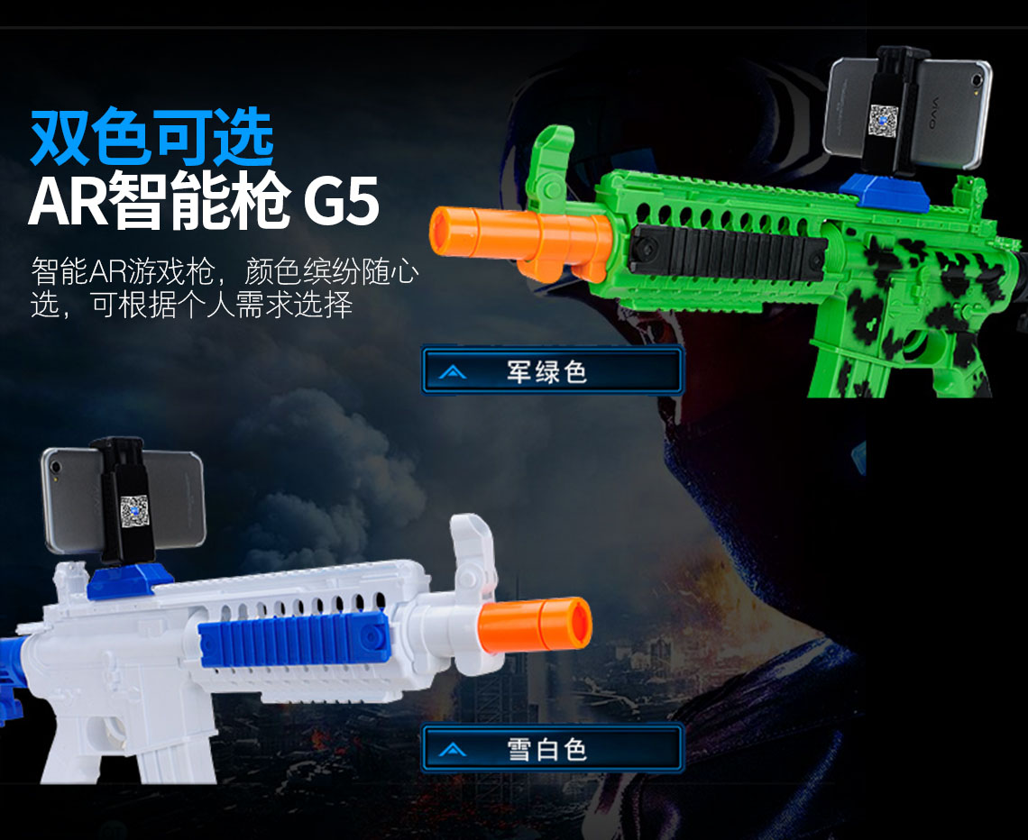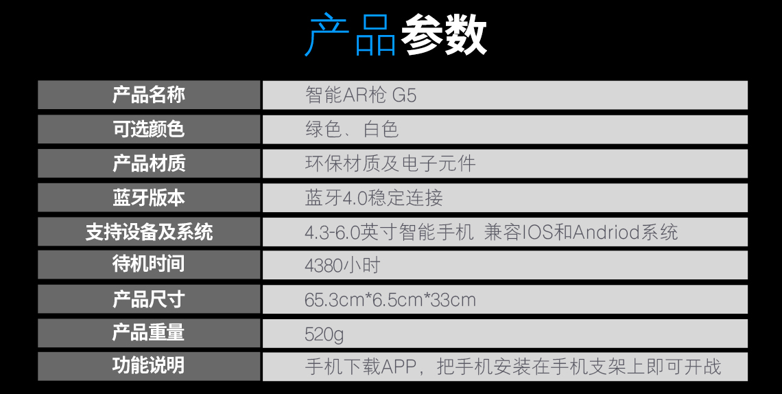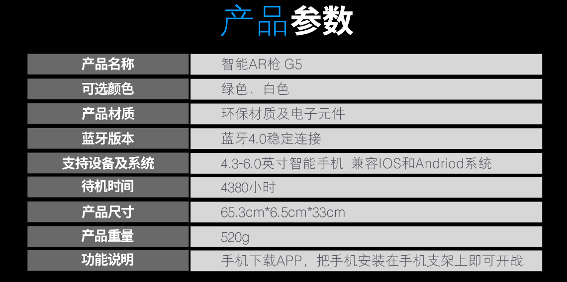 产品名称 开欧客AR枪 G5 可选颜色 白色/绿色 产品材质 环保材质及电子元件 蓝牙版本 蓝牙4.0稳定连接 支持设备及系统 4.7-6.0智能手机 兼容IOS和Andriod系统 待机时间 4380小时 产品尺寸 65.3cm*6.5cm*33cm 产品重量 520G 功能说明 手机下载APP,把手机安装在手机支架上即可开战