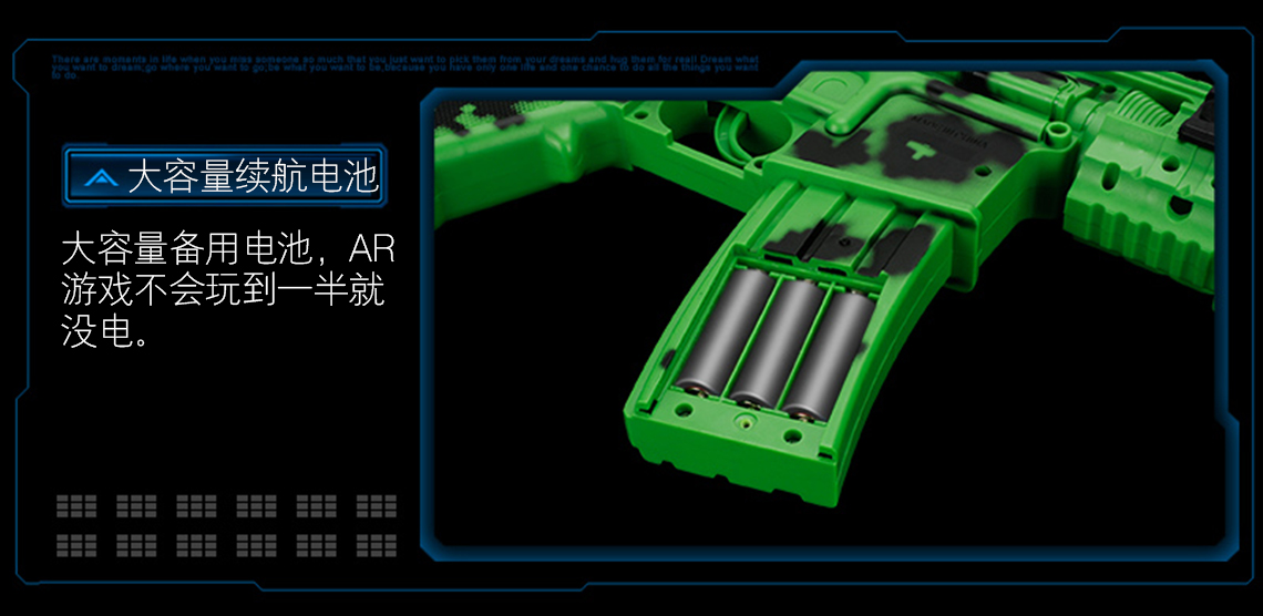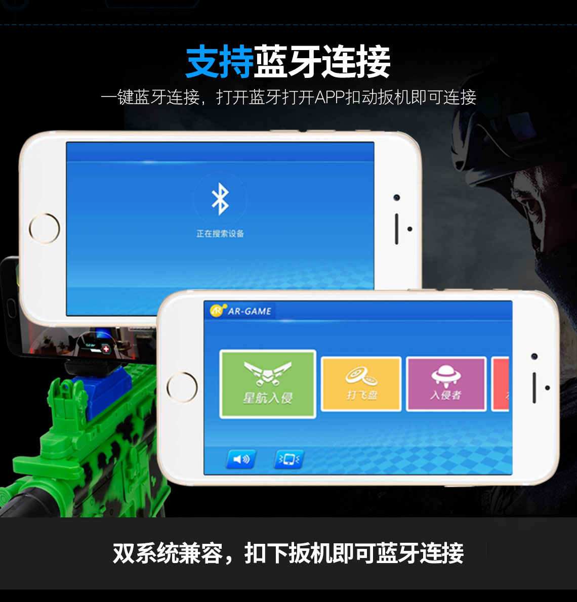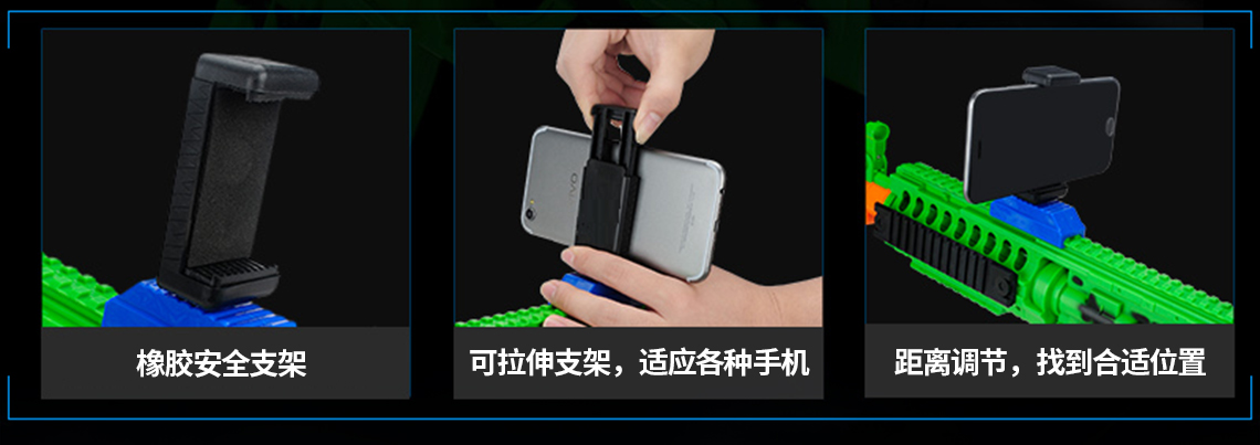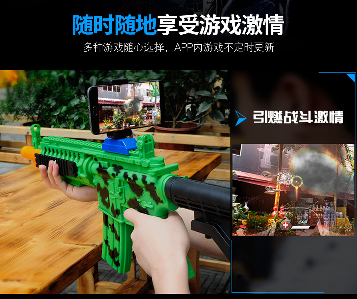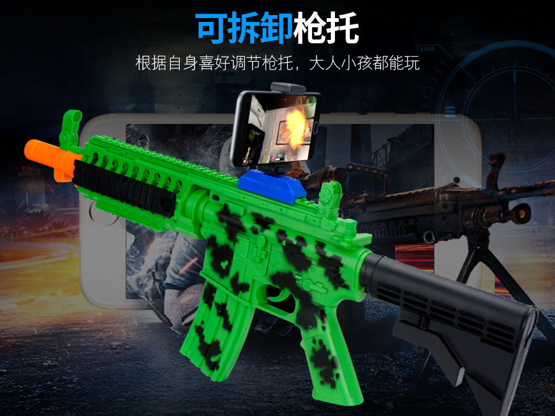 产品名称 开欧客AR枪 G5 可选颜色 白色/绿色 产品材质 环保材质及电子元件 蓝牙版本 蓝牙4.0稳定连接 支持设备及系统 4.7-6.0智能手机 兼容IOS和Andriod系统 待机时间 4380小时 产品尺寸 65.3cm*6.5cm*33cm 产品重量 520G 功能说明 手机下载APP,把手机安装在手机支架上即可开战