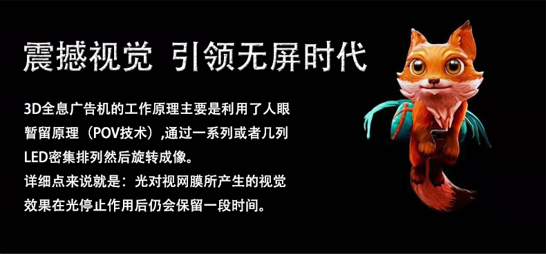 3D全息广告机能够无屏展示,也正是未来科技的一大主流,只有无屏展示才能更真实。